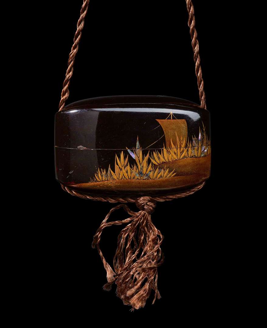 En laque ro-iro décoré en hiramaki-e, takamaki-e et raden de pêcheurs halant un bateau dont la voile émerge des bambous. L'intérieur en laque nashiji. La base signée.