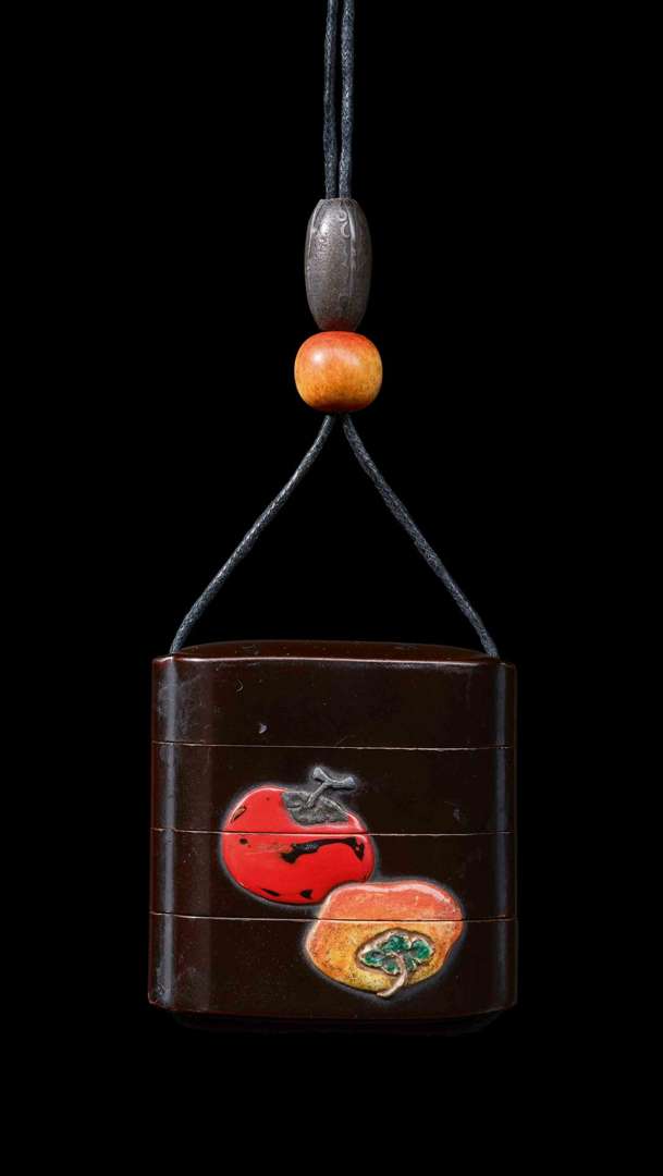 Une face ornée de deux kakis sur fond de laque brune, l'un en céramique, l'autre en laque et incrustation de plomb. L'autre face avec un poème en laque d'or. La base incisée et signée. L'intérieur en laque nashiji. Avec deux ojime dont l'un en métal repoussé.