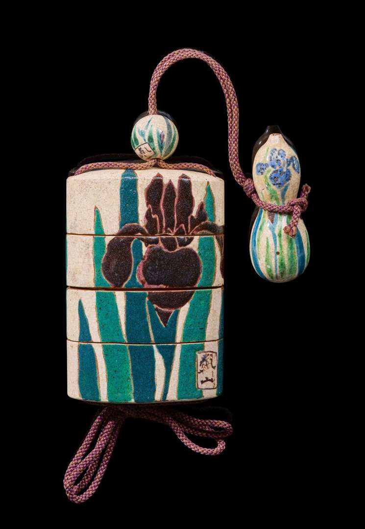 Décoré aux émaux polychromes sur fond crème d'iris en fleur dans le style Rinpa, et signé « Kenzan » dans un cartouche vertical. L'intérieur en laque d'or mat. Avec un ojime sphérique et un netsuke en forme de gourde à décor en suite et signés.