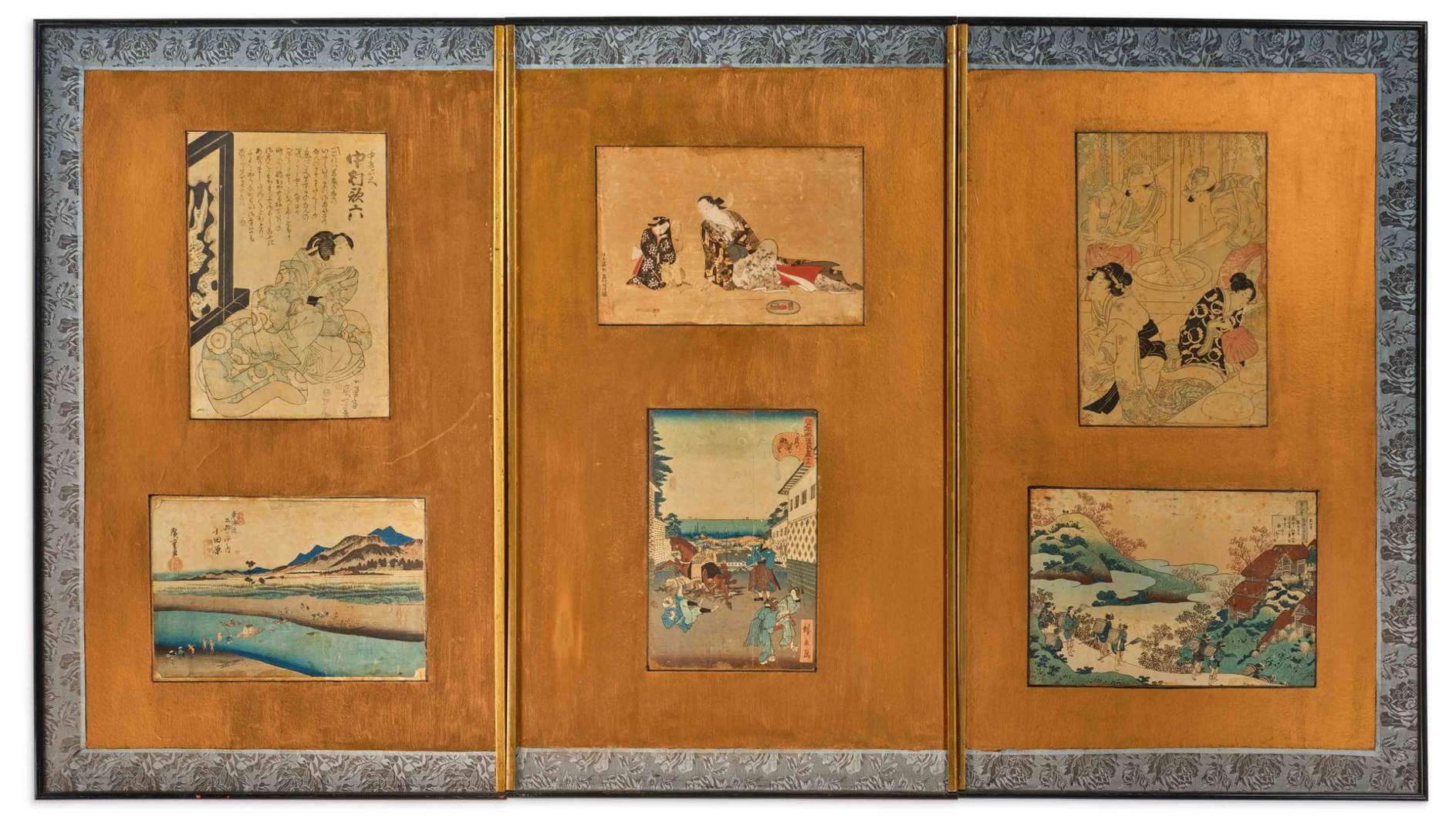Décoré d'estampes par HIROSHIGE, HOKUSAI, HIROKAGE et divers. Les estampes se détachant sur un fond or.