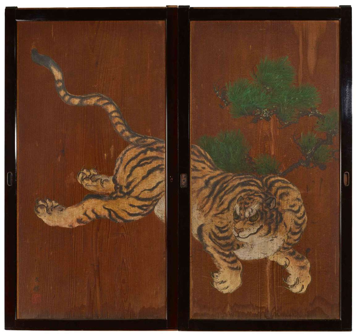 Décorées à l'encre et couleurs d'un grand tigre bondissant sous un pin. Le revers avec deux chevaux sous un pin et une glycine en fleurs. Chaque côté signé et scellé Bunrin.