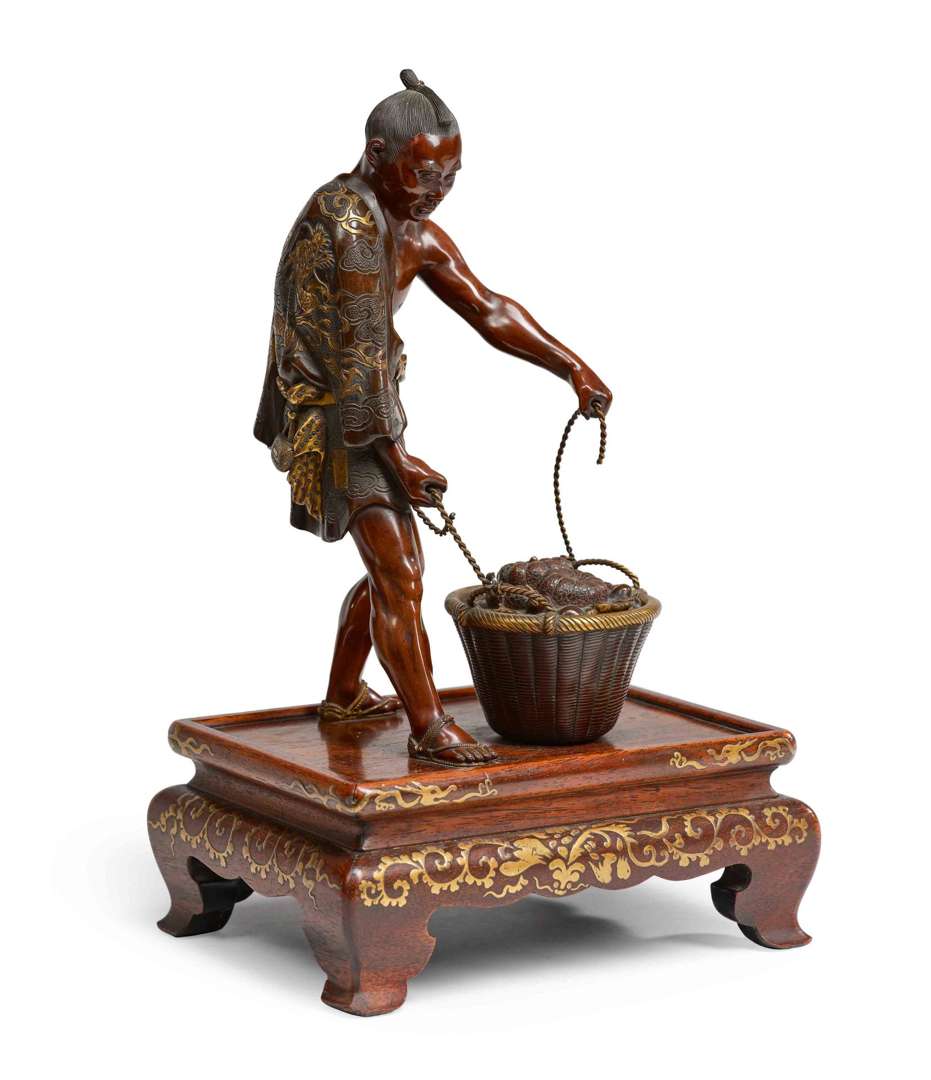 Figurant un homme soulevant un panier de légumes, vêtu d'une veste à décor de dragon parmi les nuées. Le bronze avec une belle patine. Une signature "Miyao" sur l'arrière de sa jambe droite. L'ensemble reposant sur un socle quadripode en bois naturel rehaussé de rinceaux laqués or.