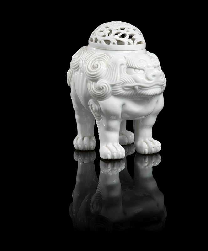 Imitant la forme d'un shishi, avec un couvercle à décor de pivoine et feuillages ajourés. Avec la marque du four Daigo.