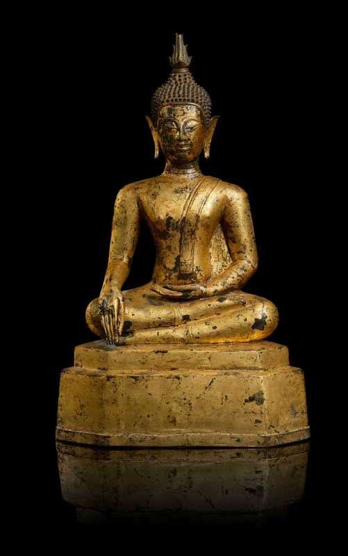 Figuré assis en padmasana sur une haute base, les mains en bhumiparsha mudra.