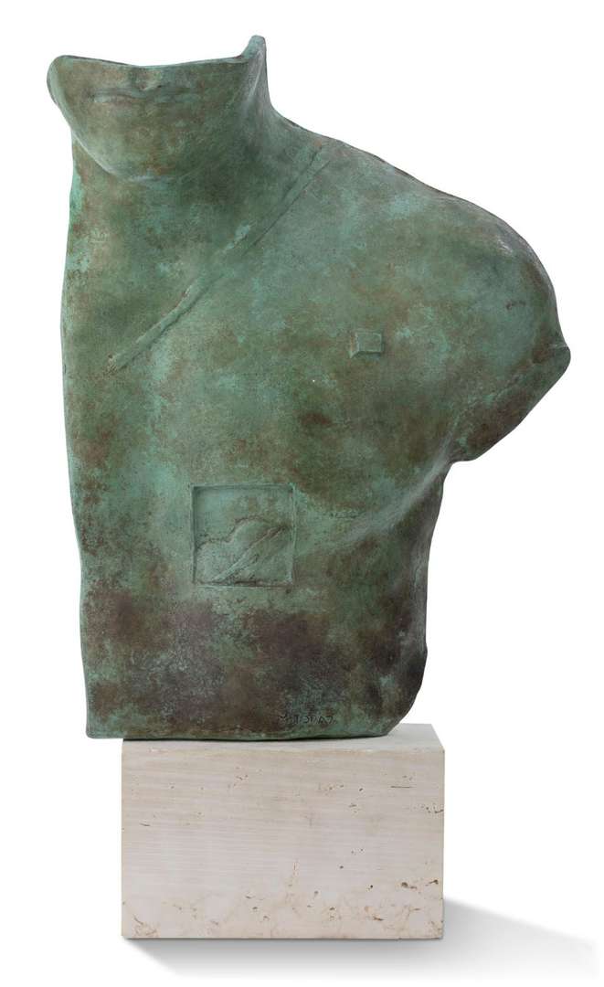 Bronze with green patina, signed at the bottom and numbered HC 948/1000 on reverse, travertine base