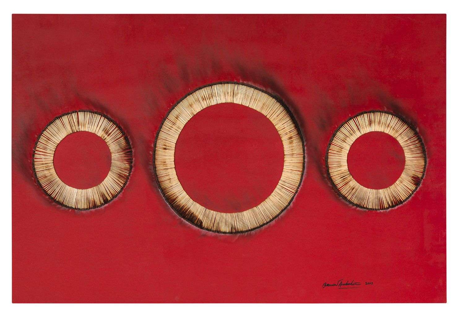 Mixed media and collage of matches on wood, signed and dated lower right