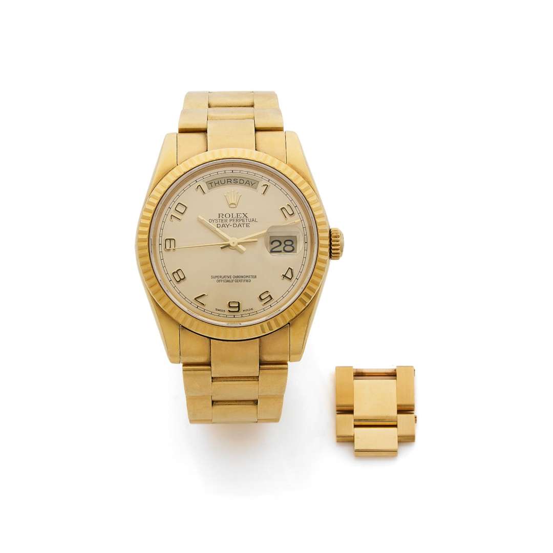 A 18k yellow gold automatic wristwatch with date and days of the week, yellow gold Oyster bracelet with deployant clasp