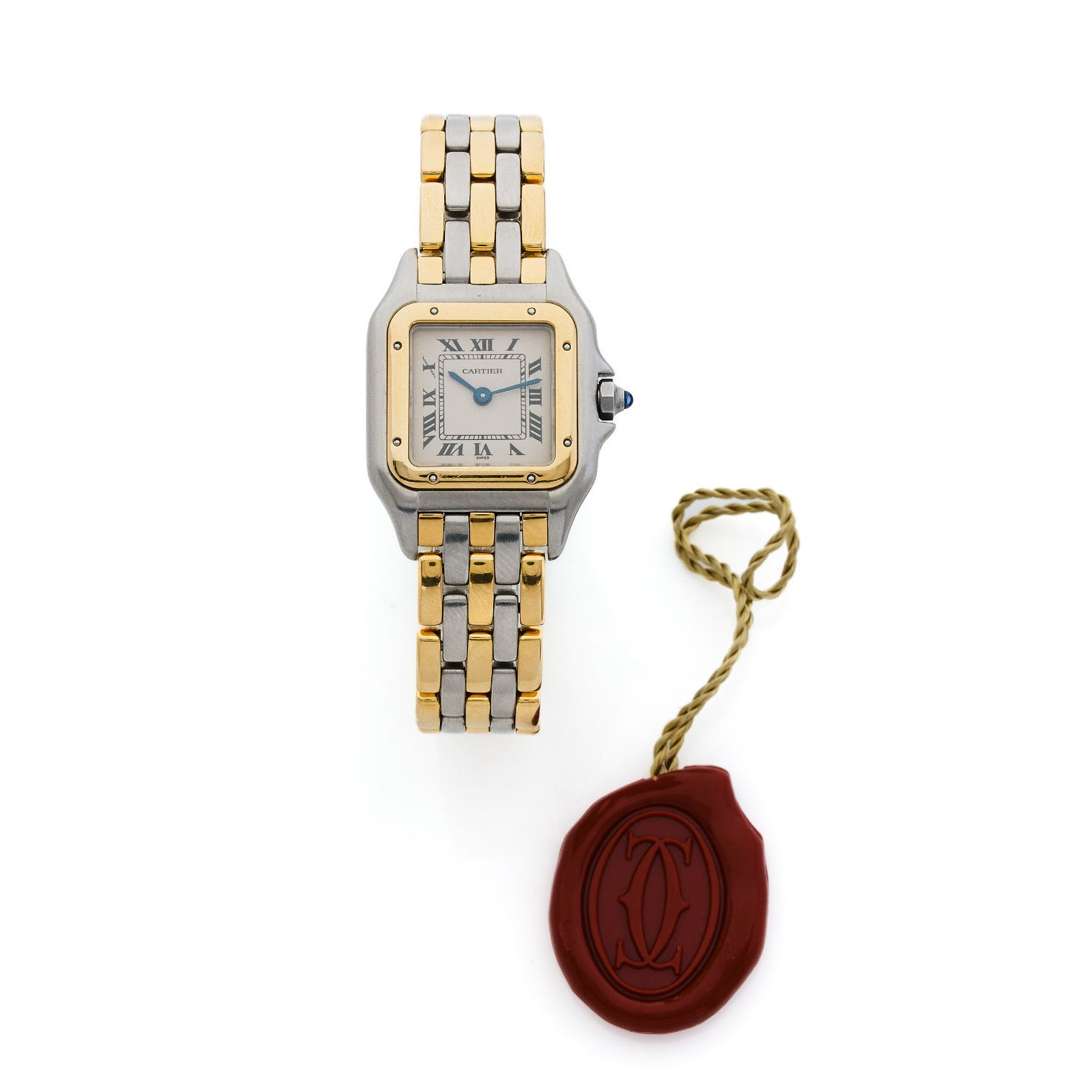A stainless steel and 18k yellow gold quartz lady's wristwatch, déployant clasp signed. With product literature and a Cartier tag