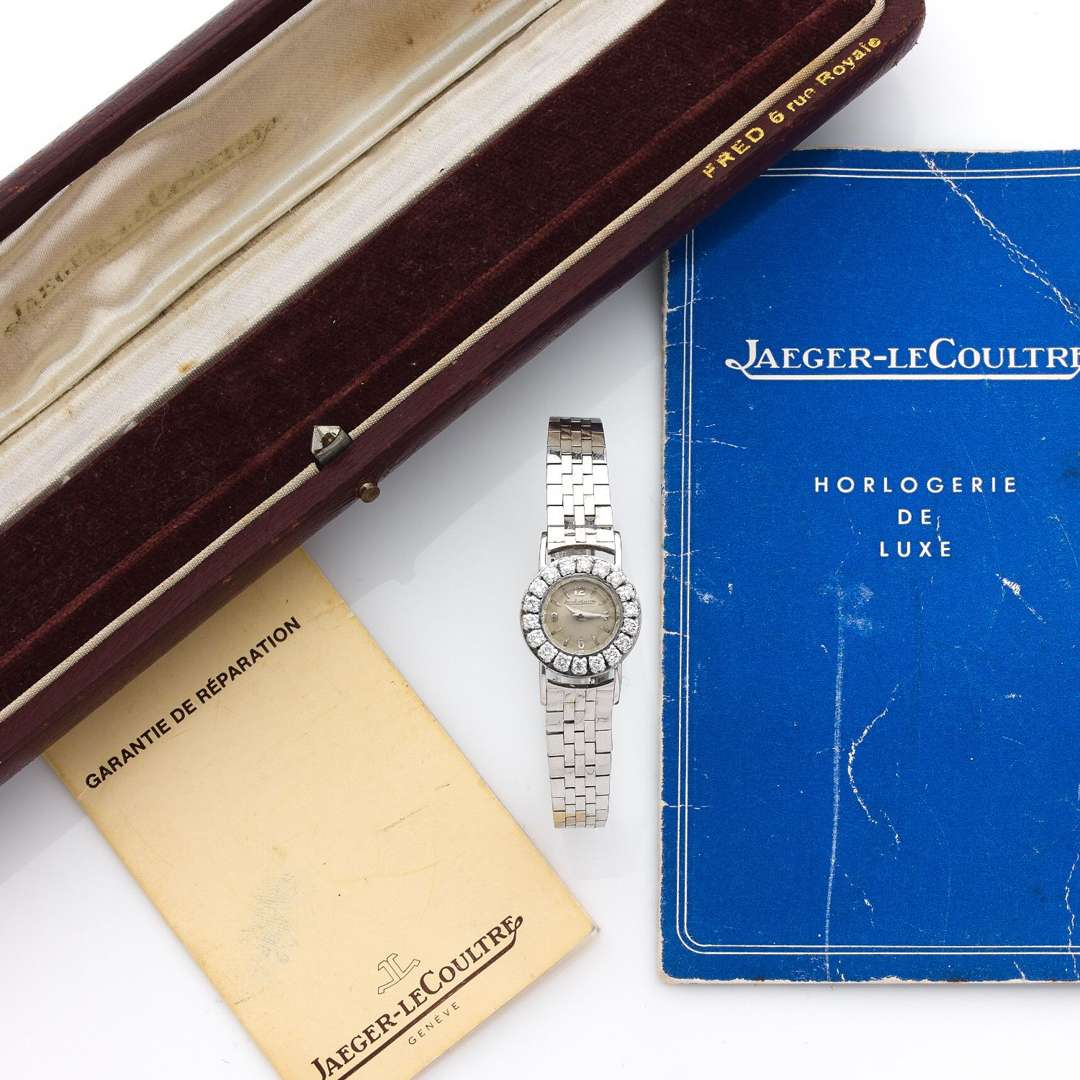 A 18k white gold and diamond-set on platinum manual winding lady's wristwatch, gold bracelet unsigned. With a certificate of origin dated 23.07.1957 stamped by Fred, a service guarantee dated 10.03.1987, a presentation box from the period signed « Jaeger Lecoultre - Fred 6 rue Royale ».