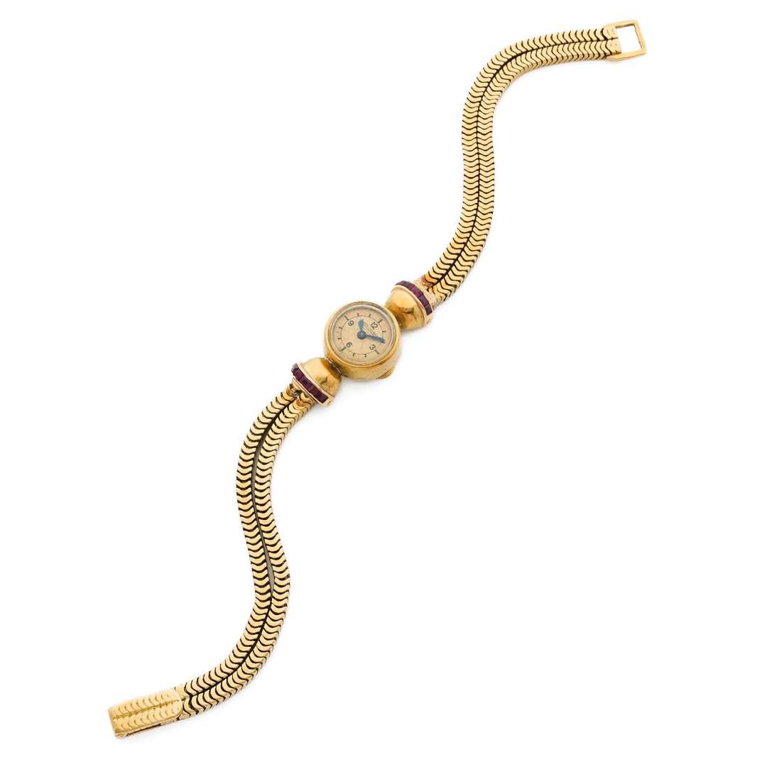 Montre bracelet de dame en or jaune 18k (750) et rubis, réalisée pour le marché français