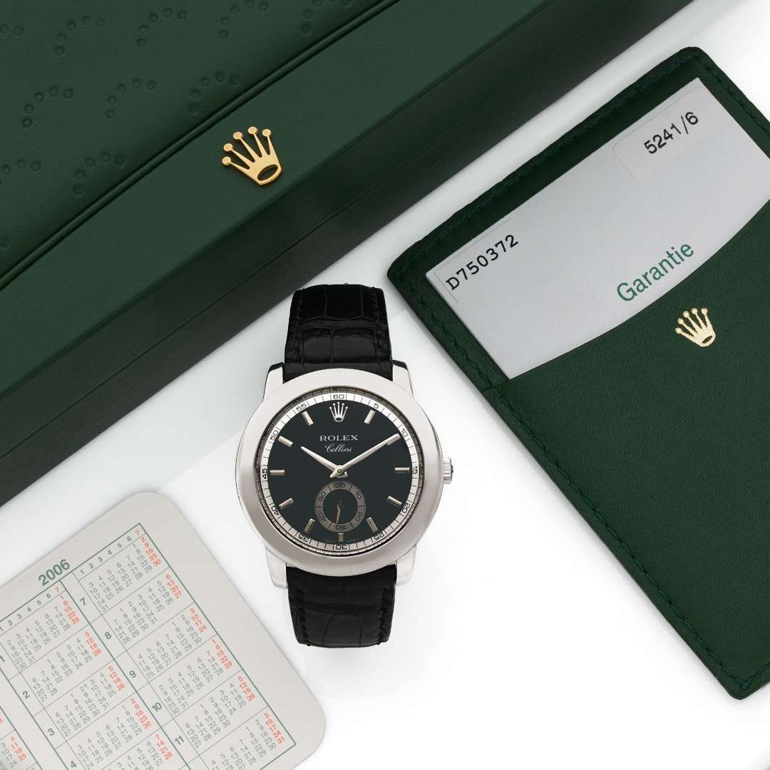 A platinum manual winding wristwatch, Rolex gold buckle. With punched guarantee dated 26.07.2011 (French retailer Vincent, South of France), a presentation box, a Rolex card-holder.