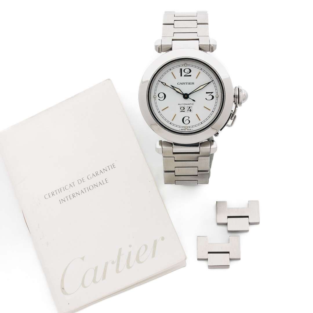 Cadran : blanc avec chiffres arabes, index bâtons appliqués, aiguilles luminescentes, trotteuse centrale et date à guichet, minuterie chemin de fer et points luminescents, signé