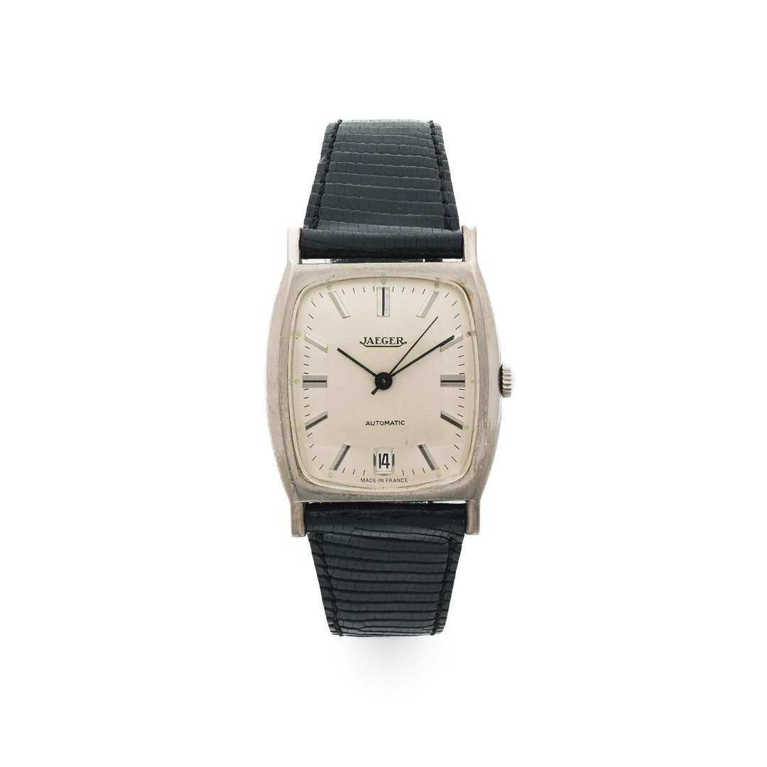 Cadran : opalin, index appliqués, plots luminescents, minuterie chemin de fer, trotteuse centrale, date à guichet, signé Jaeger et estampillé « Made in France » à 6h