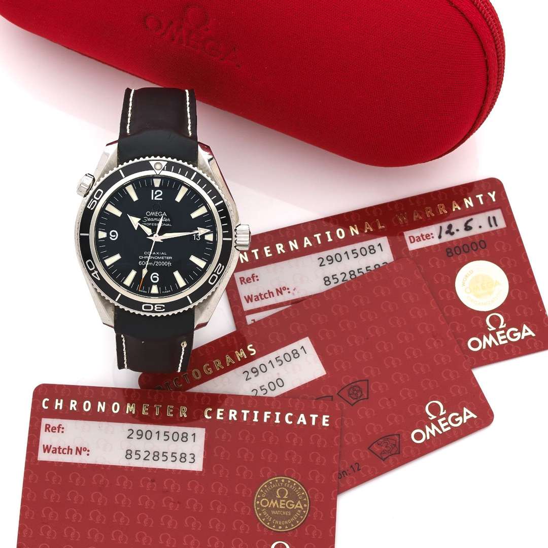 Boitier : rond, couronne et fond vissés, lunette tournante graduée pour les temps de plongée, au dos le logo Seamaster « Planet Ocean », signé