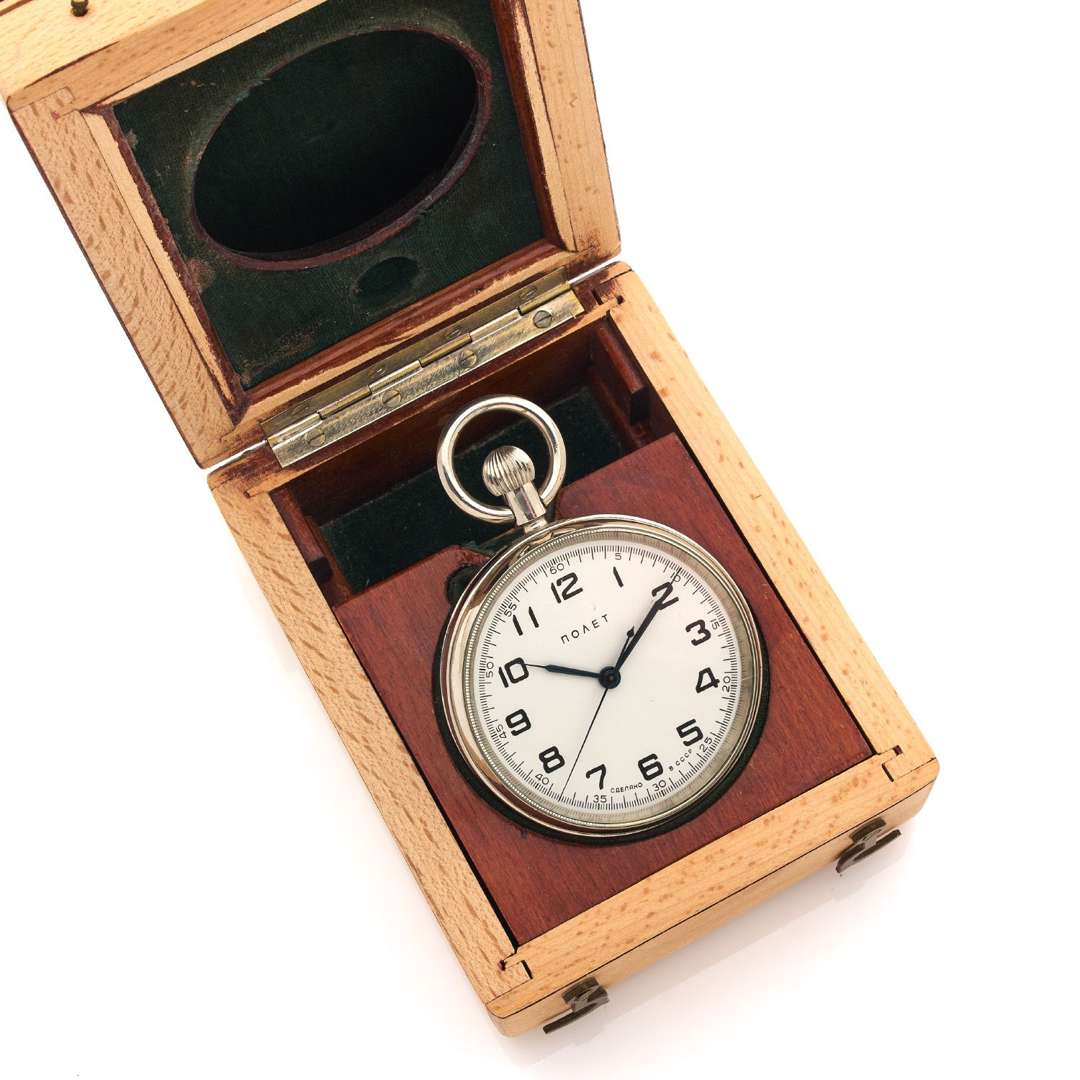 Cadran argenté avec chiffres arabes pour l'indication des heures et minutes, une minuterie chemin de fer avec graduation 1/5e de secondes, porte la mention "CCCP"