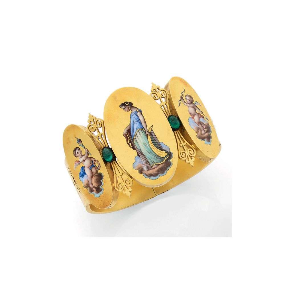 An enamel, emerald and gold bracelet, 19th Century