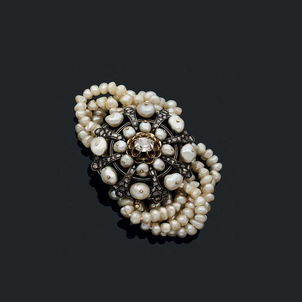 An enamel, diamond, natural pearl and gold bracelet, 19th Century