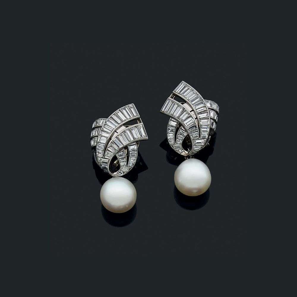 Diamants baguettes et perles de culture en pampille