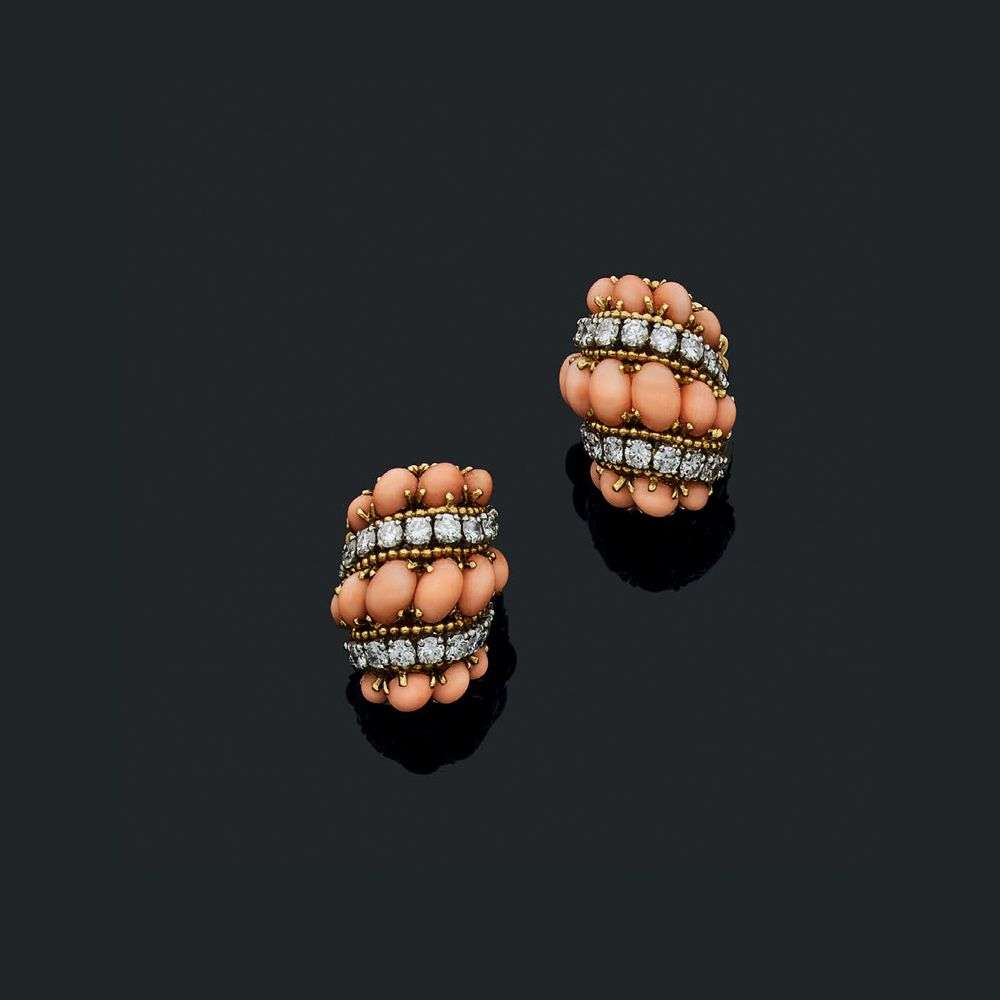 Coral, diamond and gold earrings, signed Van Cleef & Arpels