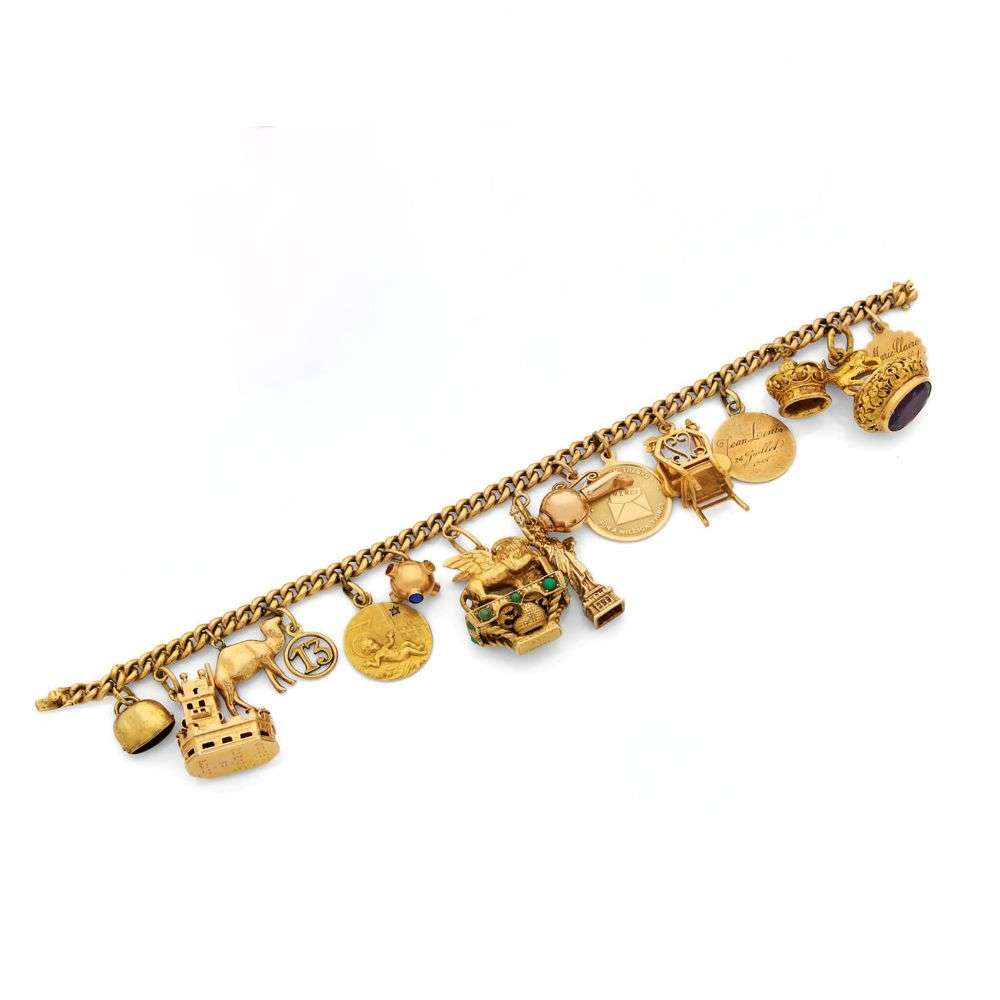 Gourmette ornée de breloques souvenirs de voyages: Venise, Rome, Lisbonne, New york... et médailles Turquoises et améthyste