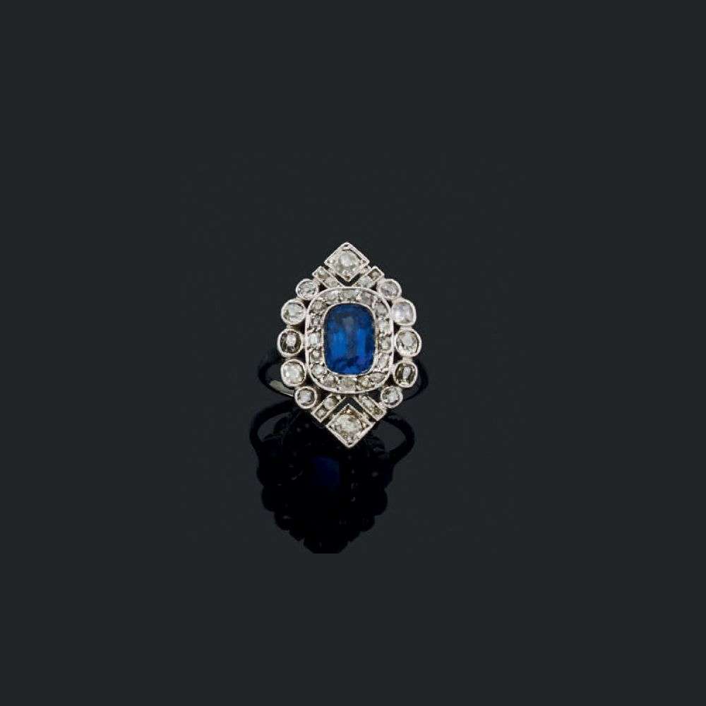 Saphir coussin, diamants taille ancienne et diamants taille rose