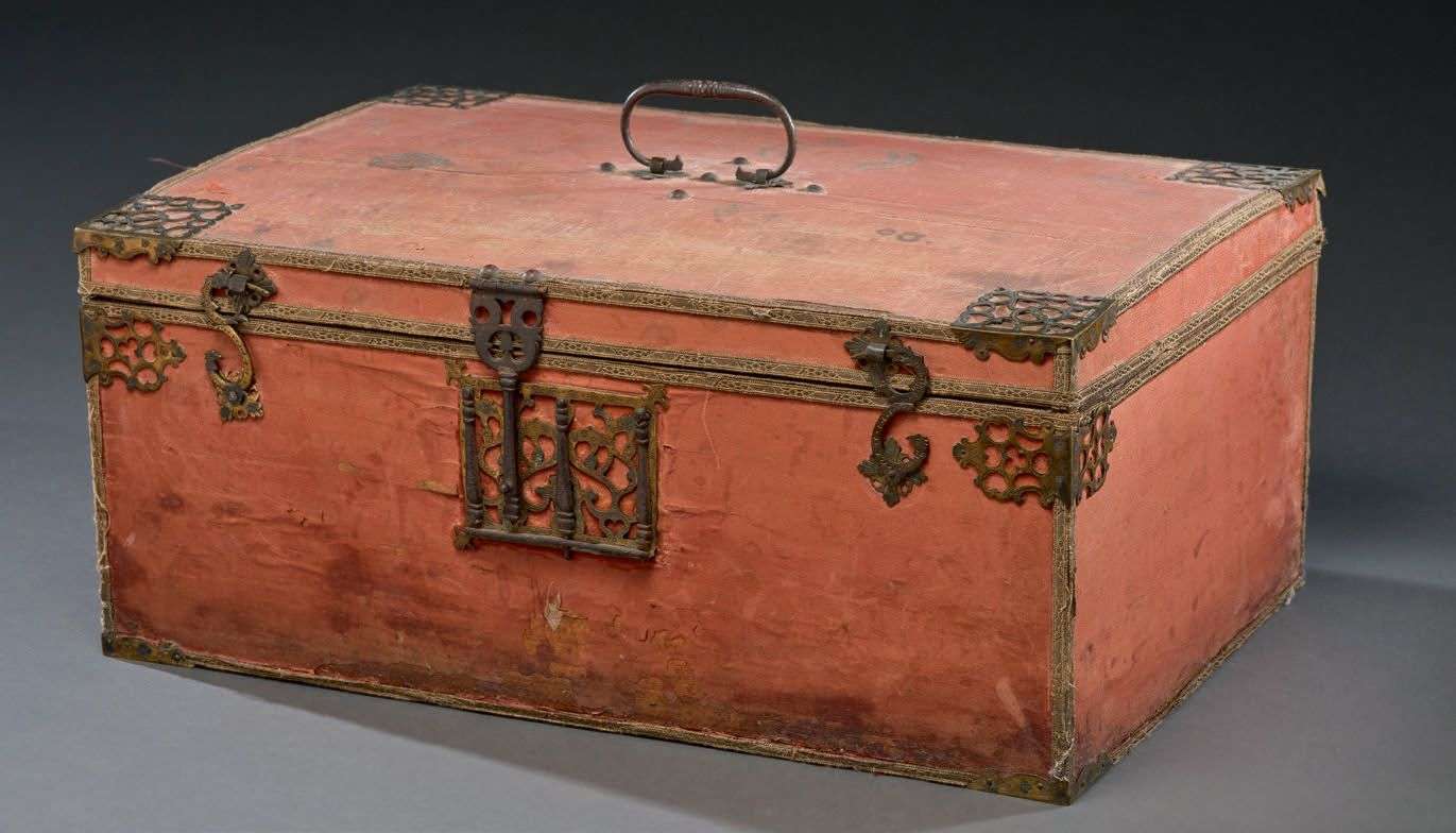 rectangulaire, le couvercle légèrement bombé. Âme de bois recouvert de velours de soie vieux rose (probablement changé), poignée sommitale, cornières et platine de serrure ajourées, crochets, moraillon en fer forgé.