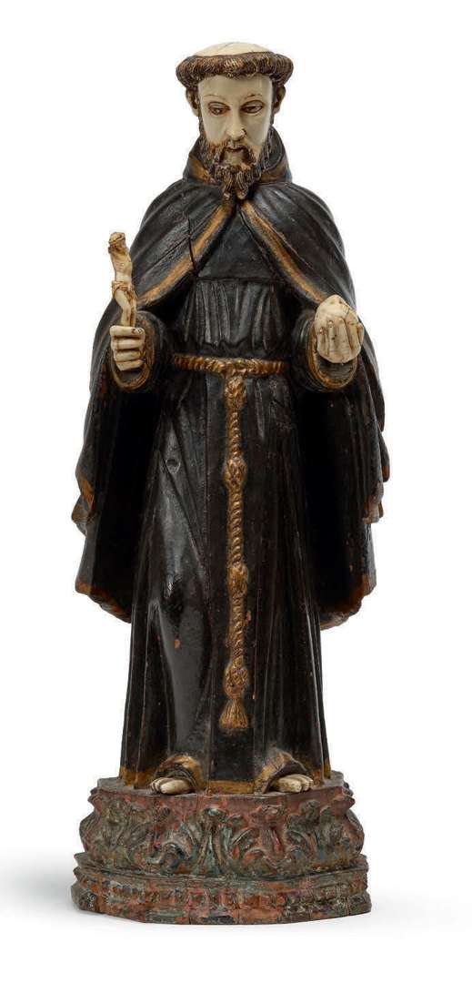 Statue en bois sculpté peint polychrome, la tête, les mains, les pieds et les attributs emblématiques (crucifix et crâne) en ivoire sculpté. Les yeux, la tonsure et la barbe peinte. Il se tient debout sur un socle sculpté de feuilles d'acanthe.