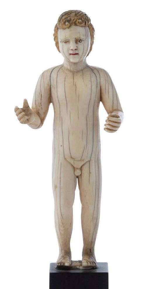 ~ Statuette d'une pièce en ivoire sculpté représentant l'Enfant Jésus se tenant debout, nu, sa main gauche tendue, le bras droit s'apprêtant à bénir. Cheveux dorés, yeux et bouche polychromés. Trou supérieur de fixation de l'auréole (manquante).