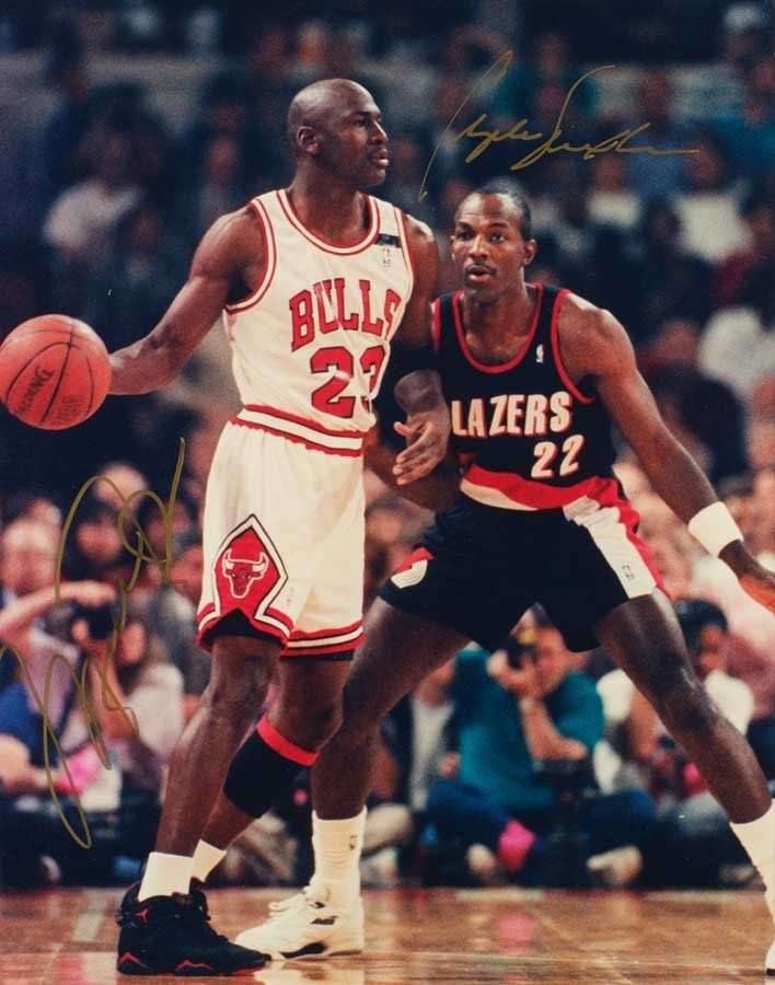 Rare autographed photograph of Michael Jordan and Clyde Drexler.