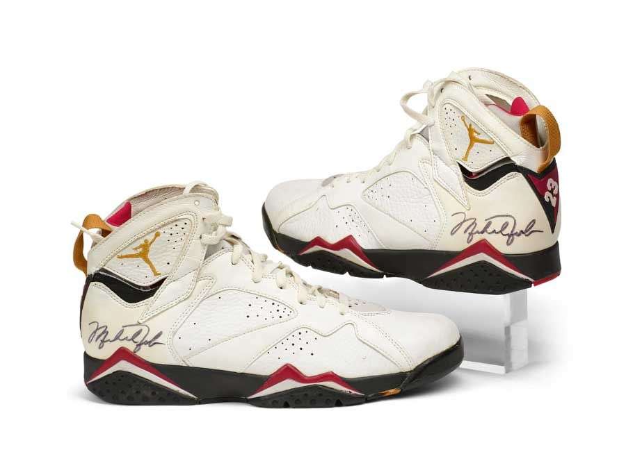 Jordan VII trainers are all white with black treads, highlighted in red with the Chicago Bulls Chicago Bulls logo. A gold Air Jordan logo appears on the side of each sneaker and a gold tongue is sewn at the back. Jordan's immortal number 23 is printed on a black and red triangle on the back of each ankle and a Nike manufacturer's label is sewn onto the inside of each tongue. This is the most iconic pair in Europe because it was the first to be imported. Michael Jordan signed the outer heel of each of these shoes.