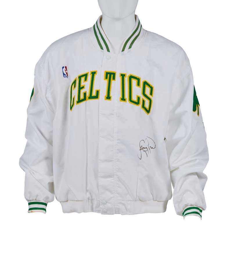 Signée par Larry Bird. Quelques taches à l'intérieur, veste blanche, verte et jaune. Larry Bird est considéré comme l'un des meilleurs joueurs de la NBA, il compte à son palmarès trois titres de champion NBA avec les Celtics de Boston et une médaille d'or olympique obtenue avec la Dream Team aux Jeux olympiques de Barcelone en 1992.