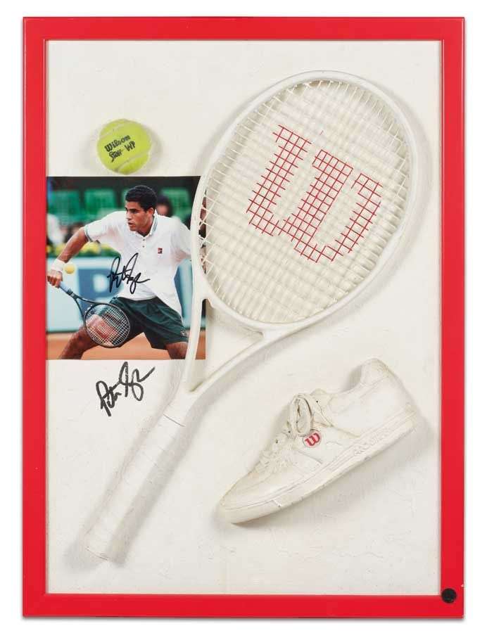 OEuvre d'un artiste non identifié au tournoi de Bâle (Suisse) en 1996 reprenant uneRaquette utilisée par Pete Sampras et une chaussure non portée. L'oeuvre est dédicacée par Pete Sampras lui-même, s'y ajoute unePhotographie dédicacée (68 x 49 cm). Il a remporté 64 titres en simple sur le circuit ATP, dont 21 titres majeurs, incluant 14 tournois du Grand Chelem, 5 Masters, et 2 Coupes du Grand Chelem.