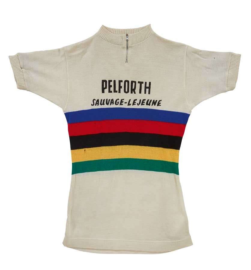 World Champion Jersey, worn by Jan Janssen during the 1965 season for the Sauvage-Lejeune team.