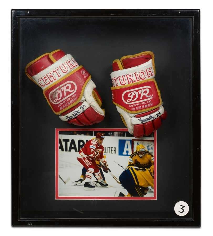 Pair of gloves, worn and signed by Sergei Makarov in 1990-91 in Calgary (Canada).
