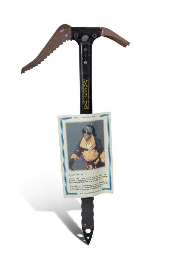 Lhotse (8501 mètres), le 1er octobre 1994, en companie de Jean Troillet. Erhard Loretan est le 3e alpiniste au monde à avoir gravi les 14 sommets de plus de 8000 mètres après Reinhold Messner et Jerzy Kukuczka. Le piolet est signé par Erhard Loretan. On y ajoute unePhotographie dédicacée de l'alpiniste Erhrad Loretan escaldant un mur de glace conduisant au sommet du Shisha Pangma (8046m) en 1986.