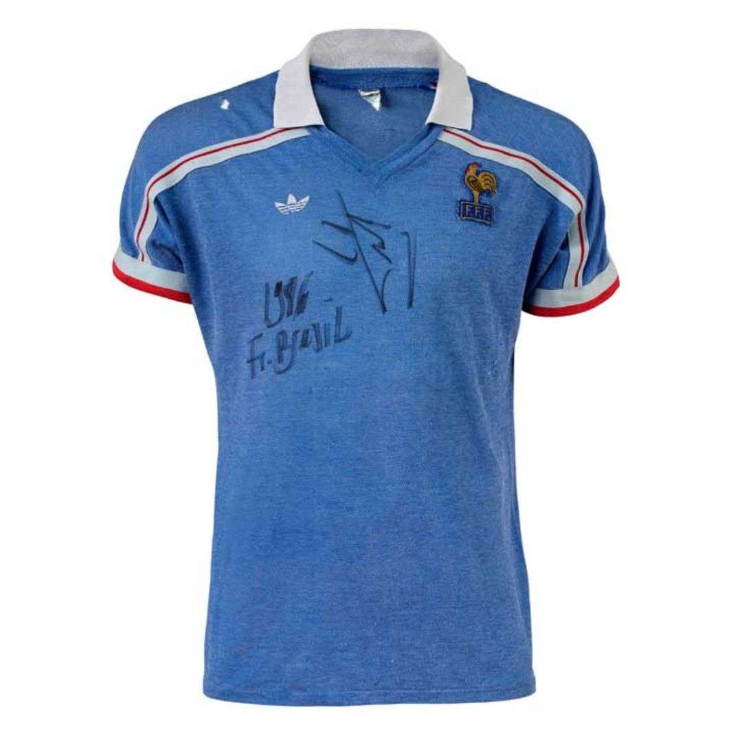 France jersey No. 9, worn and signed by Luis Fenandez for the French team during the 1986 World Cup quarter-final in Mexico against Brazil (1-1, 4-3 on penalties) on June 21, 1986.