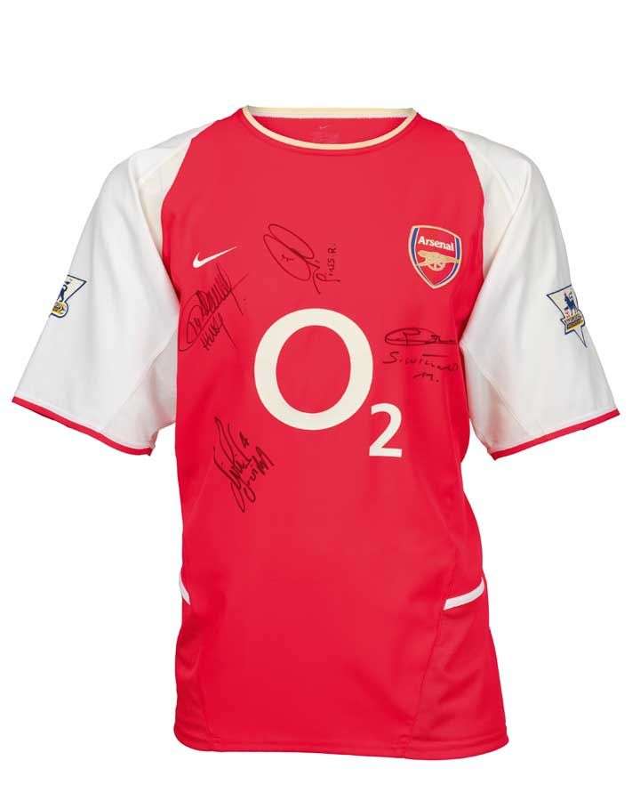 Maillot 2003-04 signé par Thierry Henry, Sylvain Wiltord, Patrick Vieira et Robert Pires. Arsenal fait un exploit unique dans le football moderne en ne concédant aucune défaite en championnat et reçoivent un trophée en or. L'effectif de cette saison historique est surnommé les "Invincibles" d'Arsenal.