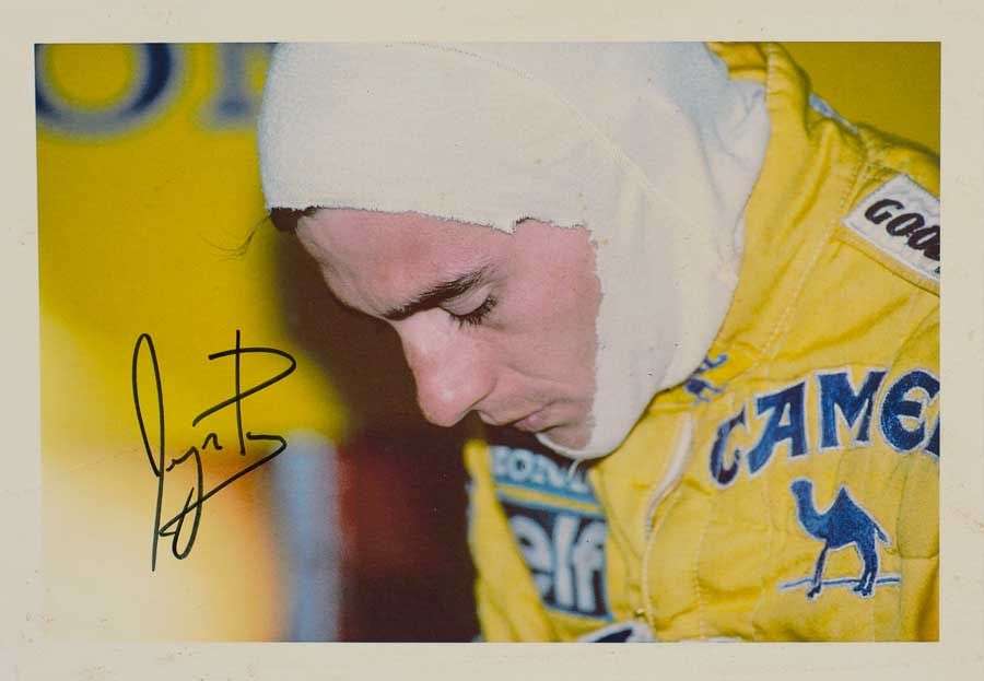 Couleur imprimée. Ayrton Senna regardant vers le sol portant sa balaclava blanche, avec sa tenue Camel.