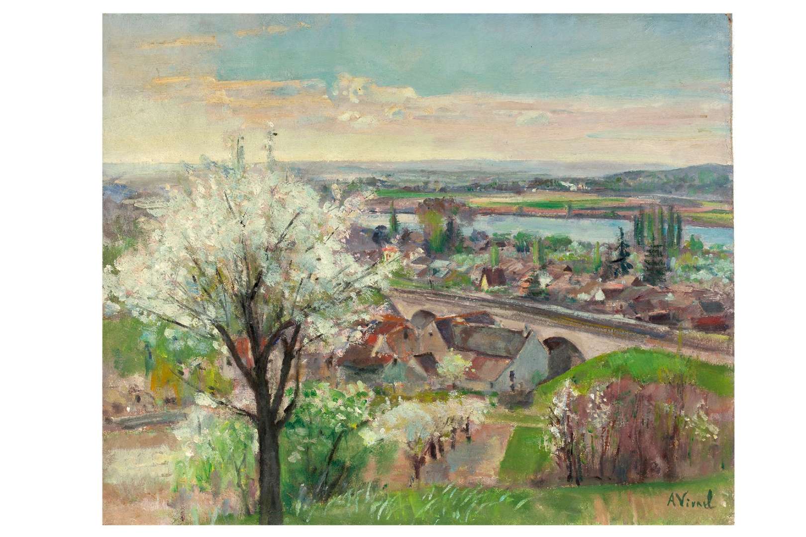 André-Léon Vivrel est né en 1886 à Paris. À seulement 15 ans, il décide de devenir peintre. Il est soutenu dans cette voie par sa mère, qu'il décrit comme son premier maître, et son père, négociant en vin et Premier prix de dessin en 1870. Élève au lycée Louis-le-Grand, André-Léon Vivrel rentre à l'Académie Julian en 1910. Il y suit les enseignements de Paul Albert Laurens puis fréquente l'atelier de Marcel Baschet et d'Henri Royer à l'École des Beaux-Arts. Il loue un atelier à Montmartre, au 65 rue Caulaincourt, à seulement huit numéros de celui d'Auguste Renoir. Sa première participation au Salon des artistes français date de 1913. Mobilisé en 1914, il reçoit la Croix de guerre pour conduite héroïque en 1917. Après la guerre, il retrouve son atelier montmartrois. Il se voit décerner une mention honorable au Salon de 1920 et l'État lui achète les deux natures-mortes qu'il expose au Salon des indépendants. Il y présente également deux portraits de Bretonne peints au retour d'un séjour à Ploumanac'h (Côtesss d'Armor). En 1922, Vivrel apparaît pour la première fois au Salon de la Société Nationale des Beaux-Arts. Après avoir reçu le prix Deldebat de Gonzalva en 1932, il obtient, l'année suivante, une médaille d'argent au Salon des artistes français avec « Le Temps des cerises ». En 1934, Vivrel présente des baigneuses, premier tableau d'une série de grands nus envoyés au Salon jusqu'en 1943. Aboutissement de sa recherche sur le nu féminin, ses « Baigneuses » de 1939 sont gratifiées d'une médaille d'or au Salon des artistes français. Cette ultime récompense couronne une médaille d'argent obtenue par Vivrel en 1937, lors de l'Exposition internationale des Arts et Techniques de Paris. La critique salue unanimement son talent et, en 1940, Louis Paillard n'hésite pas à écrire à la une du « Petit journal » du 6 mai 1940 : « André Vivrel, apparaît je le proclame, comme l'un des meilleurs en ce Salon [des artistes français] ». L'exposition « Vivrel - peintures récentes », organisée par la Galerie de Berri en mai 1942, illustre, en 31 tableaux, la diversité des genres abordés par Vivrel mais c'est celui du paysage qu'il explore avec le plus de passion. Sa terre d'élection est le Loiret, où son frère aîné Marcel possède une résidence secondaire à Châtillon-sur-Loire, non loin de Champtoceaux. Aux lendemains de la Grande Guerre, désargenté, il s'y réfugie pour peindre sur le motif à moindres frais. Au printemps 1926, Vivrel est de nouveau en Bretagne, d'où il rapporte le « Port de Camaret » exposé au Salon des Tuileries de 1926. Quelques années plus tard, en 1934, il retourne en Côtes d'Armor, où il compose des marines qui sont autant d'études de ciel. Vivrel passe l'été 1926 en Corse. Il y réalise des aquarelles qui sont présentées, dès l'automne, à la Galerie Georges Petit puis à New York. À chaque fois, une critique unanime vante leurs qualités : « L'exposition d'André Vivrel est d'un artiste sensible, fin, tout en restant larggge dans ses conceptions. Ses vues de Corse, de Bretagne et de Paris sont comme ses fleurs délicatement harmonieuses » (« La Semaine à Paris », 12 novembre 1926, p. 63). En 1928, il se rend de nouveau dans le Midi. Restituant la chaude et vibrante lumière de Provence, il peint « Le port de Saint-Tropez » exposé, la même année, au Salon des Indépendants. Le thème de la Méditerranée s'impose également au Salon des Tuileries, où Vivrel présente des vues de port et des paquebots, témoins d'une industrie touristique florissante. Quand Vivrel n'est pas sur les routes de France, il prend Paris pour modèle. Il peint les ruelles de la butte Montmartre et les monuments de la capitale, comme la cathédrale Notre-Dame, qu'il décline en série à l'instar de Monet. Il aime à s'attarder sur les quais de la Seine, qui lui offrent de nombreux points de vue insolites sur la ville et lui inspirent des peintures qui ne sont pas sans rappeler les paysages parisiens d'Albert Lebourg. Peignant jusqu'à son dernier souffle, André-Léon Vivrel s'éteint à Bonneville-sur-Touques, le 7 juin 1976.