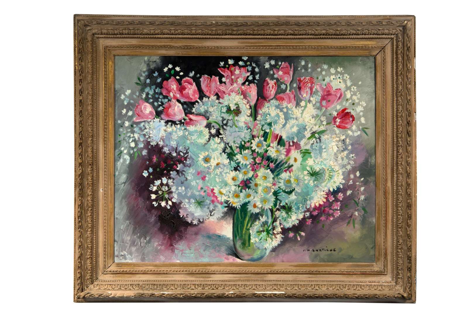 Bouquet de fleurs d'ail, tulipes roses et gypsophile dans un vase, 1964