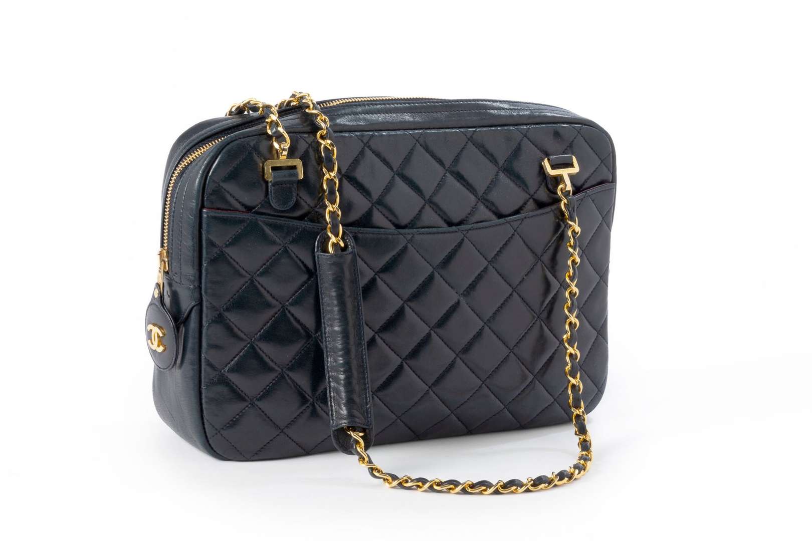 Sac vintage en cuir matelassé bleu marine, double anse-chaine et garniture en métal doré. Deux poches plaquées extérieur