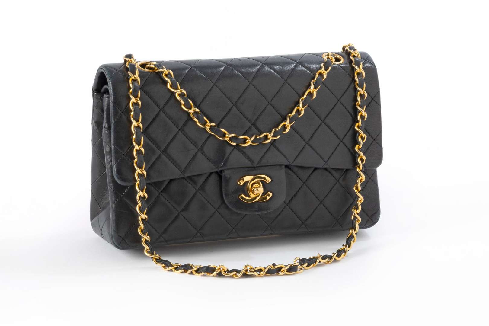 Sac en cuir matelassé noir. Doucle anse-chaine et garniture en métal doré.