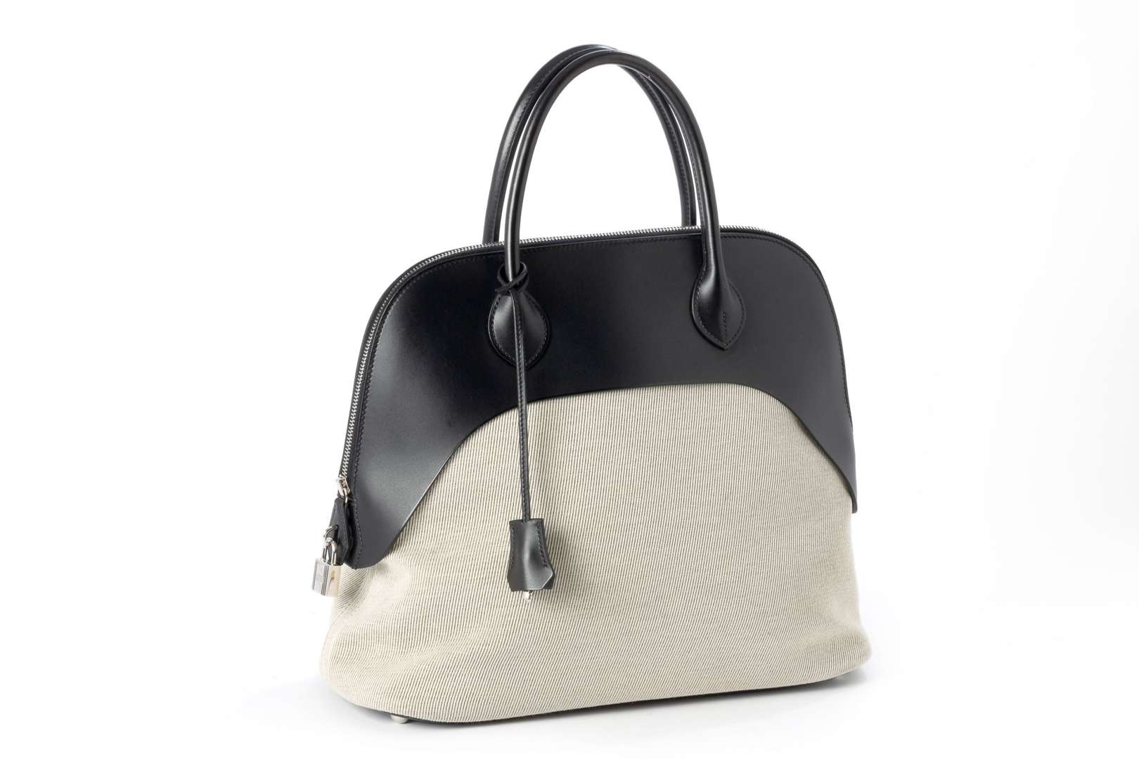 Sac en cuir lisse noir et tissu beige. Garniture métal argenté.
