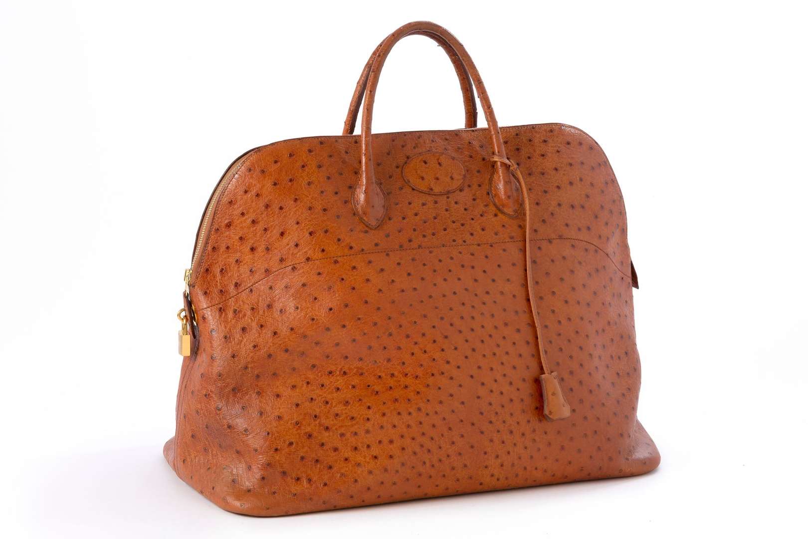 Sac en cuir d'autruche marron, garnitures en métal doré.