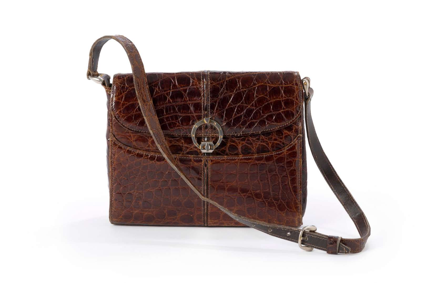 Sac à main en crocodile marron. Anses ajustables pour un porté épaule.