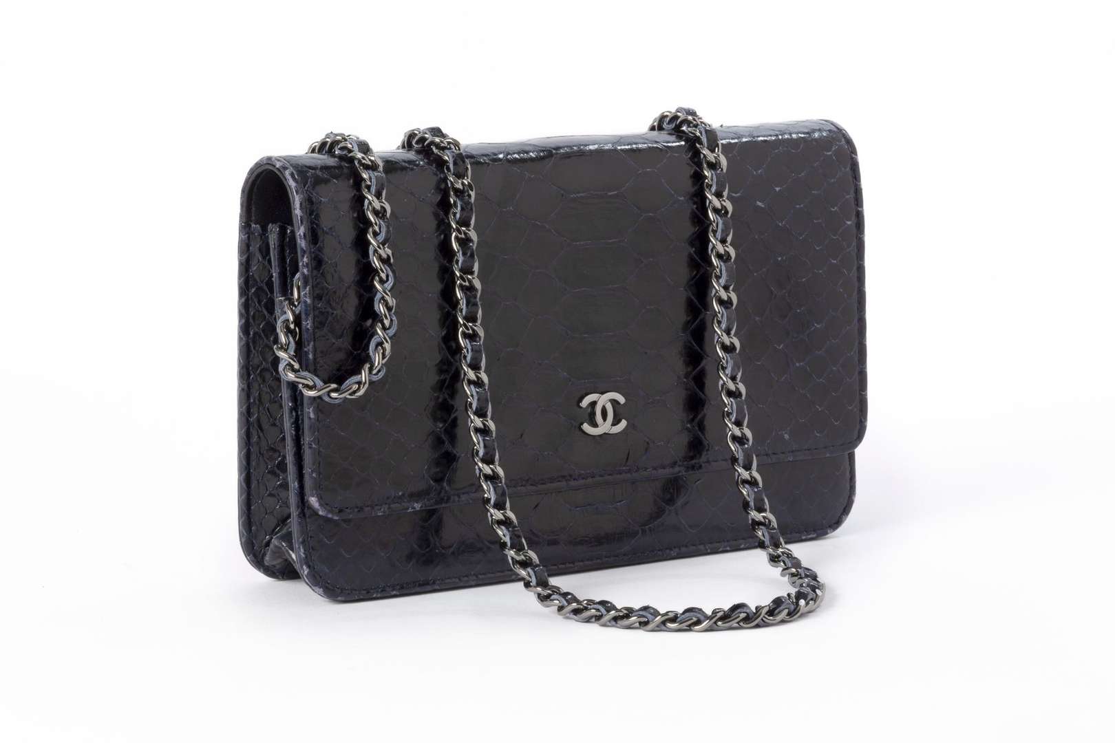 Sac du soir en python (pythonidae) II/B vernis bleu marine. Bandoulière-chaine et garniture en métal argenté. Une poche plaquée au dos.