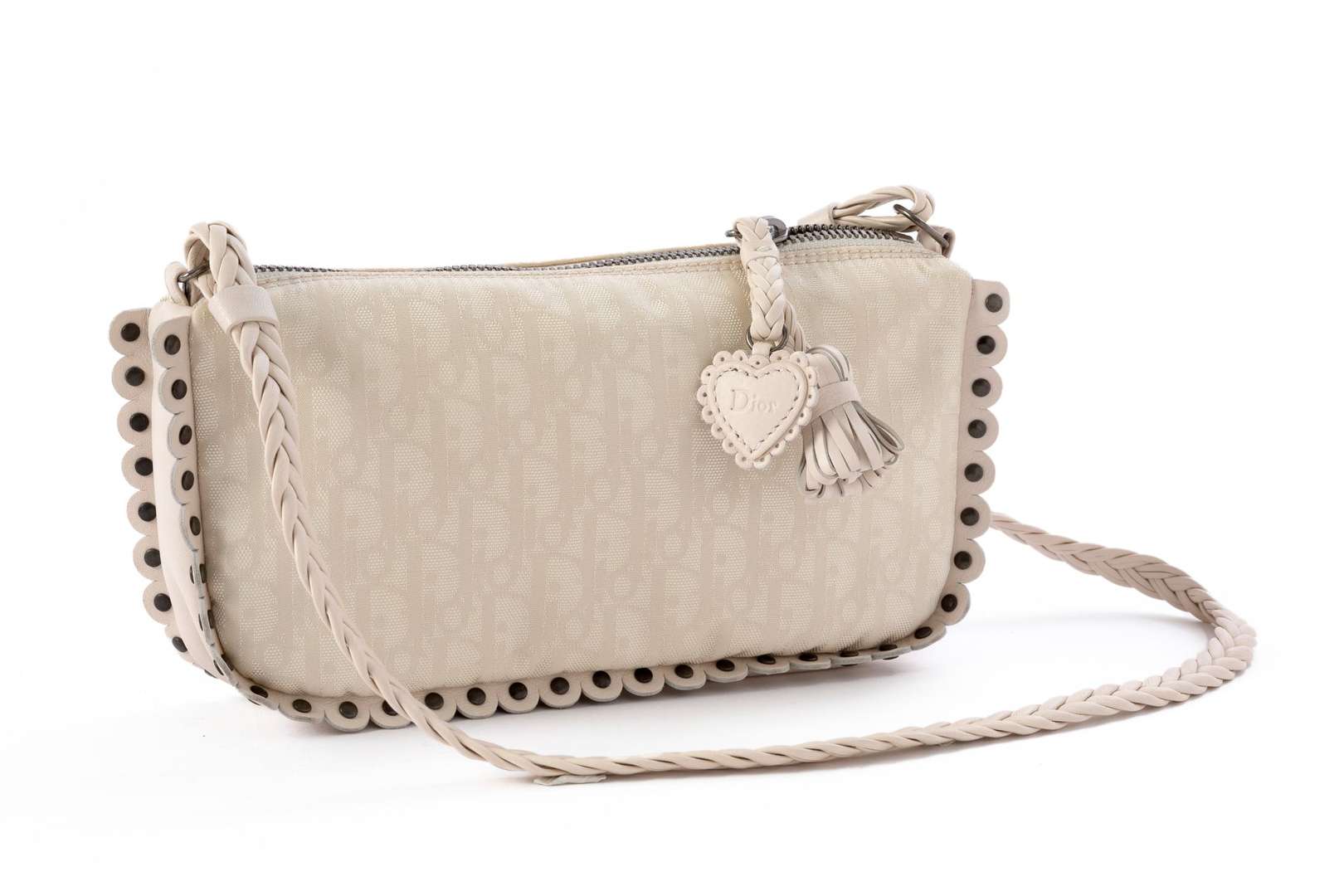 Petit sac en toile monogrammée et cuir crème. Anse bandoulière en cuir tréssé.