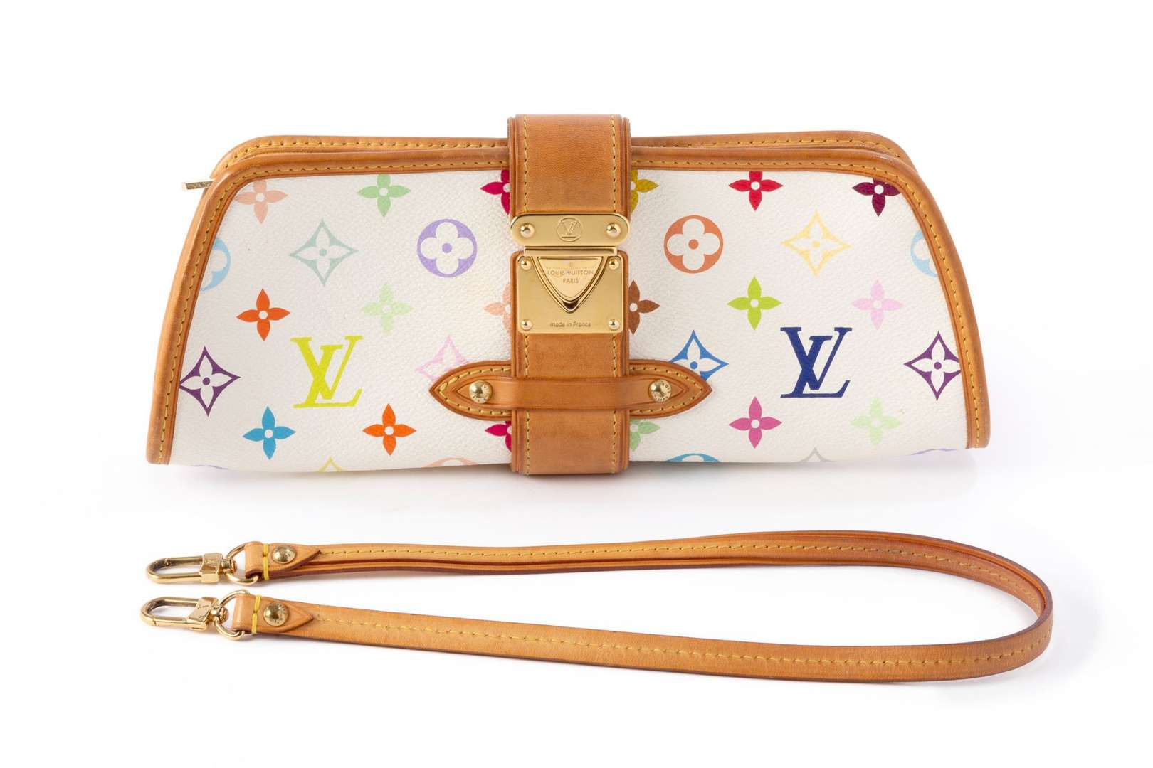 Sac en toile monogram multicolore et cuir naturel, garniture en métal doré. Anse amovible pour un porté épaule.