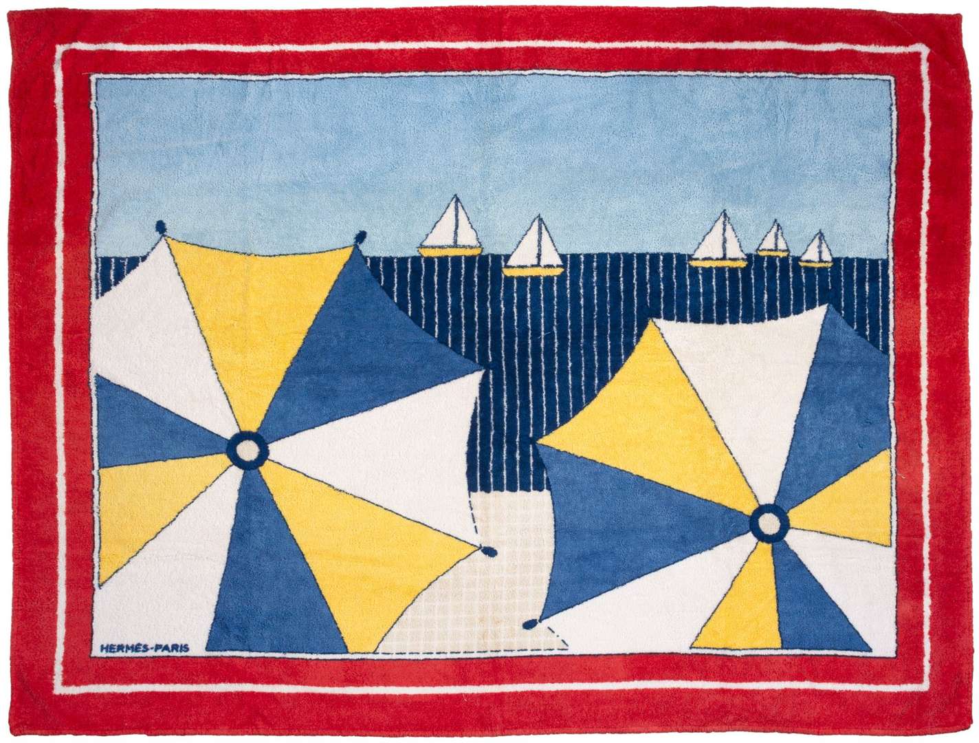 Grand drap de plage en coton éponge, à motif de "Bateaux sur l'eau" dans les tons de bleu, jaune, blanc et bordure rouge.