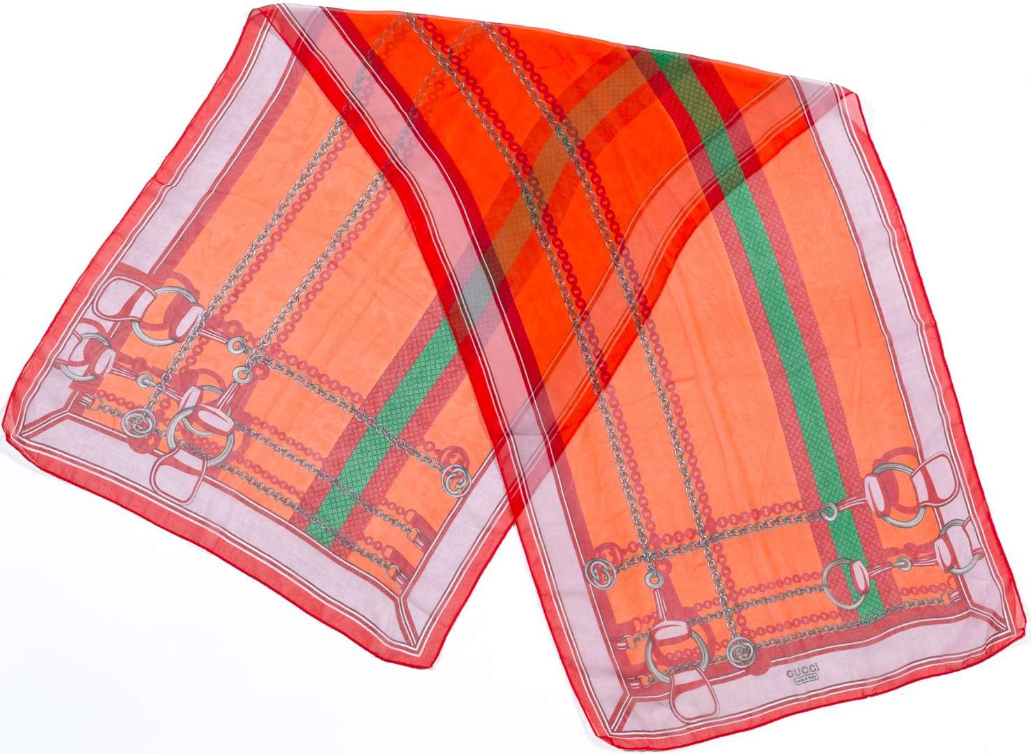 Echarpe légère en mousseline dans les tons de orange et rouge à décors de chaînes.